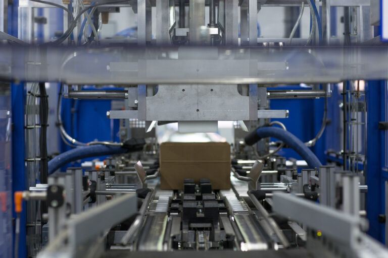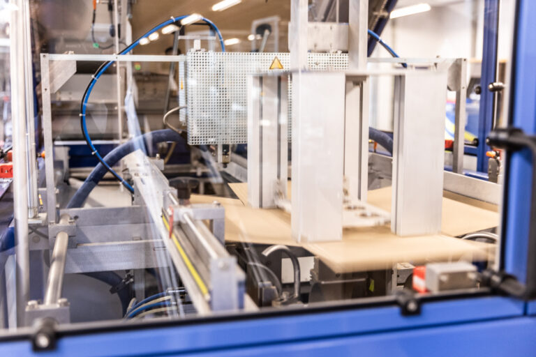 Seine Reise zu dir tretet dein Päckli zunächst als einfacher Wellpapp-Zuschnitt an. Unser Kartonaufrichter richtet den Zuschnitt auf, rillt ihn, faltet ihn, und leimt ihn anschliessend. So wird daraus ein Kartonbehälter.