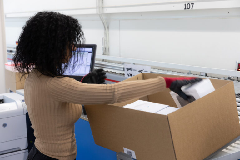 Der Karton gelangt daraufhin zu einem Kommissionier-Port. Dort ist bereits eine oder einer unserer Mitarbeitenden zur Stelle und befüllt ihn mit den von dir bestellten Waren. Unsere Mitarbeitenden sind so geschult, dass sie dabei möglichst wenig Füllmaterial verwenden.